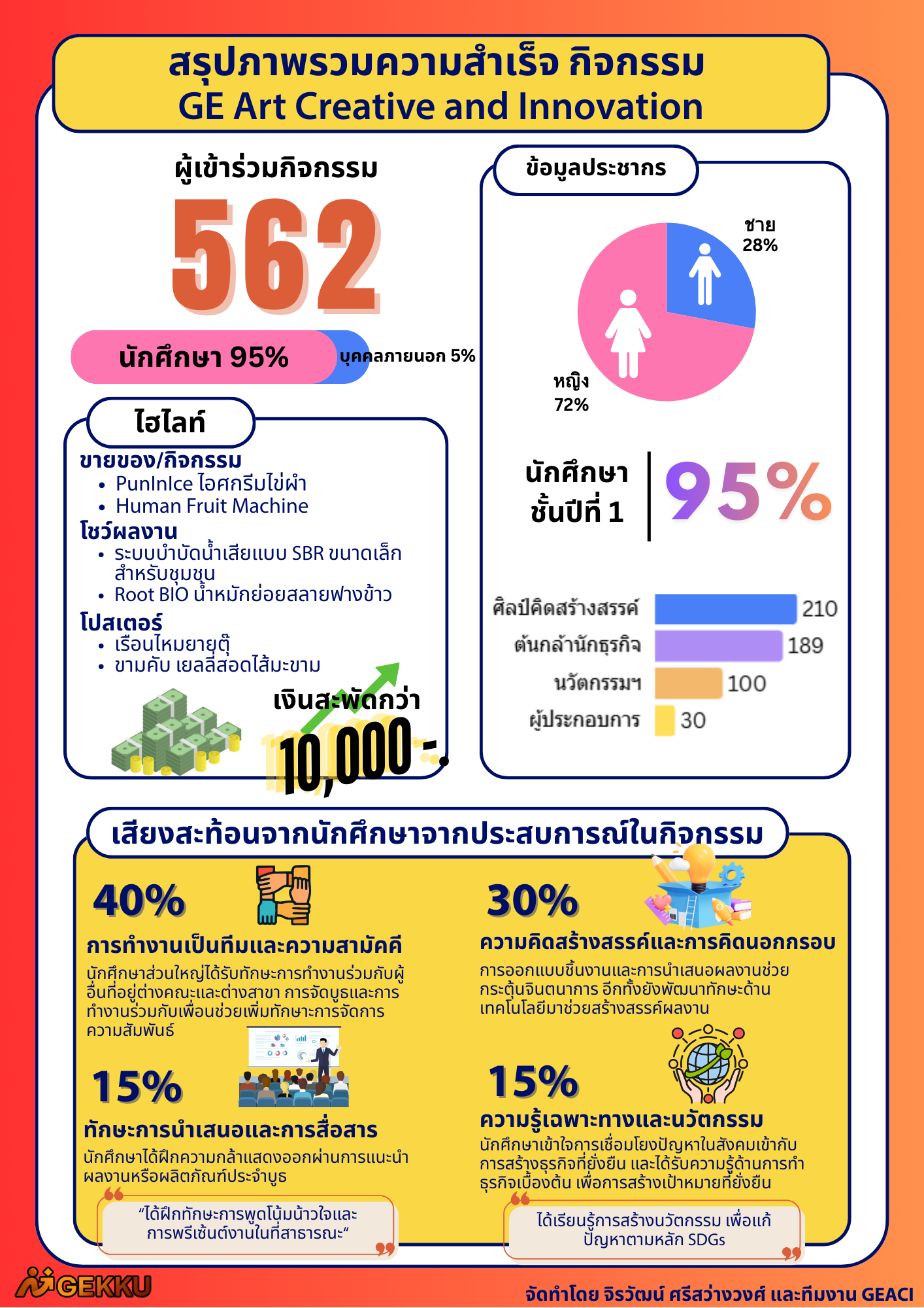 นิทรรศการ GE Art Creative and Innovation ในครั้งนี้ สะท้อนความมุ่งมั่นของมหาวิทยาลัยขอนแก่นในการพัฒนานักศึกษาให้เป็นผู้มีความคิดสร้างสรรค์ มีทักษะการประกอบการ และมีจิตสำนึกต่อการพัฒนาที่ยั่งยืน ผ่านการบูรณาการการเรียนรู้จากหลากหลายศาสตร์ ภายในงานเต็มไปด้วยบรรยากาศแห่งความคึกคัก ทั้งจากผู้เข้าชมที่สนใจเดินชมผลงานนวัตกรรมและสินค้าสร้างสรรค์ นักศึกษาผู้จัดแสดงที่กระตือรือร้นนำเสนอผลงาน และการแสดงศิลปวัฒนธรรมที่สร้างสีสันให้กับงาน สร้างพื้นที่แห่งการเรียนรู้และแรงบันดาลใจที่จะนำไปสู่การสร้างนวัตกรรมที่ตอบโจทย์สังคมและชุมชนอย่างแท้จริง